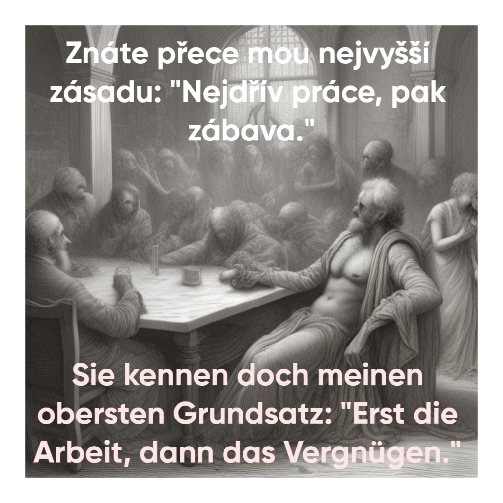 Sie kennen doch meinen obersten Grundsatz: “Erst die Arbeit, dann das Vergnügen.” Znáte přece mou nejvyšší zásadu: “Nejdřív práce, pak zábava.”