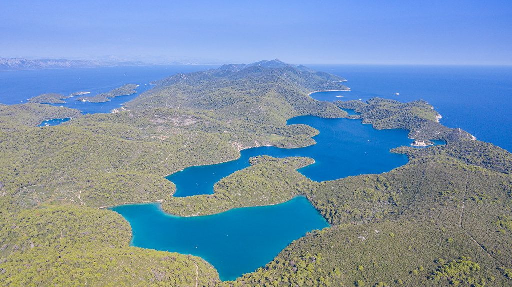 Luftbild der Seen Veliko Jezero und Malo Jezero im Nationalpark Mljet, Kroatien