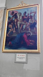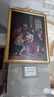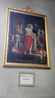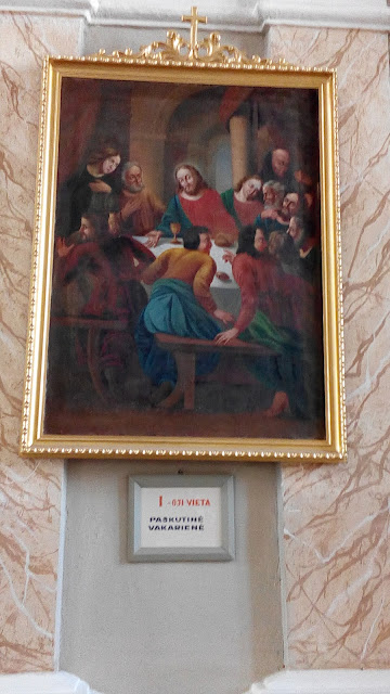 Křížové cesty v našich krajích jsou povětšinou typizovány do 14 tzv. zastavení, přičemž to první bývá “Ježíš je odsouzen k smrti”. V Litvě, ale i v Polsku jsem poprvé viděl křížové cesty s daleko více zastaveními, což je i případ tohoto kostela. A název prvního zastavení, litevsky vieta – doslova místo, zde zní “Poslední večeře – paskutiné vakariené.