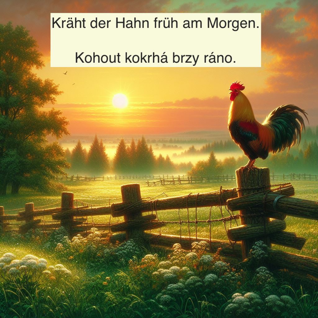 Kräht der Hahn früh am Morgen. – Kohout kokrhá brzy ráno.