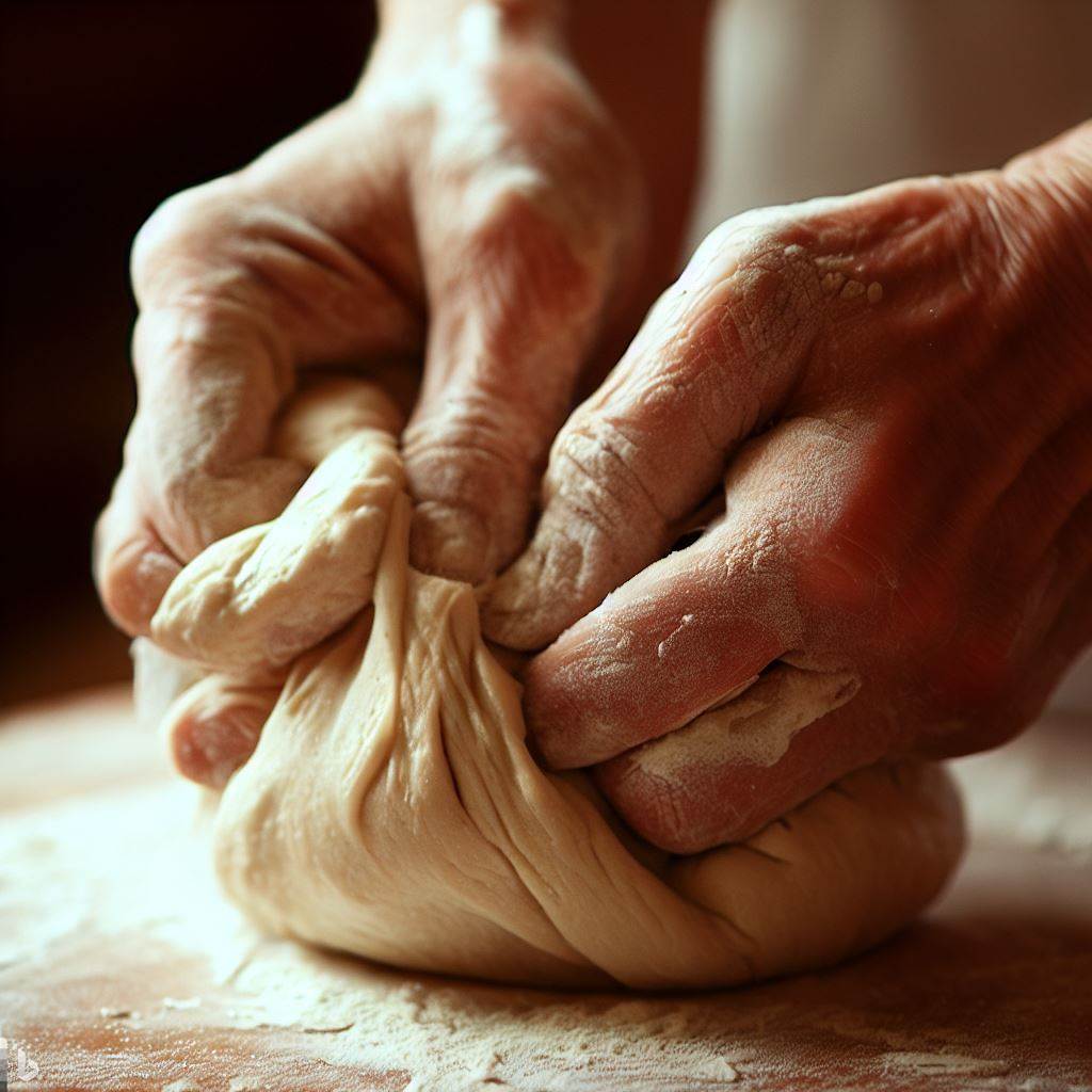 In der Zwischenzeit den Teig zubereiten. Dazu die beiden Sorten Mehl mischen und mit Wasser und Salz zu einem glatten Teig kneten. – Mezitím si připravte těsto. K tomu smícháme oba druhy mouky a prohněteme s vodou a solí, aby vzniklo hladké těsto.