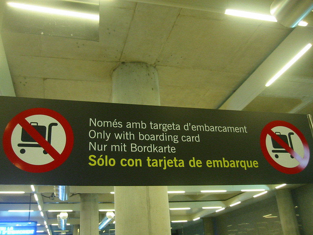 Bitte halten Sie Ihre Bordkarte am Schalter bereit. – Na přepážce mějte prosím připravenou palubní vstupenku.