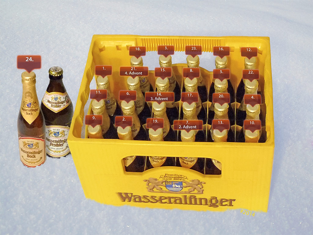 Der Adventskalender ist in allen möglichen Formen verbreitet, besonders beliebt sind die Schokokalender für Kinder, die mit Schokoladen befüllt sind. Ab dem 1. Dezember zählt man die verbleibenden Tage bis Heiligabend ab. – Adventní kalendář je rozšířený ve všech možných podobách, oblíbené jsou především čokoládové kalendáře pro děti, které jsou plněné čokoládami. Od 1. prosince odpočítávejte zbývající dny do Štědrého dne.