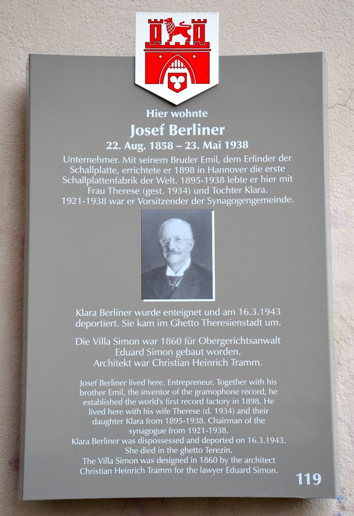 Josef Berliner, městská tabule Hannover č. 119, podnikatel, předseda synagogální obce, bratr Emil, vynálezce gramofonové desky, manželka Therese, dcera Klara vyvlastněna, deportována, terezínské ghetto