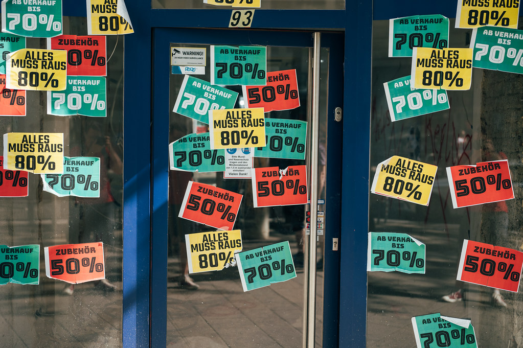 Aufkleber mit 50% bis 80% Rabatt auf dem Schaufenster eines geschlossenen Geschäfts.