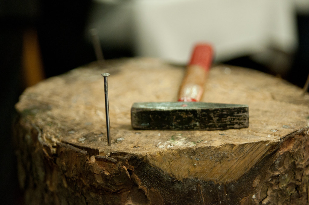 etwas mit Nägeln befestigen (beim Bau von Möbeln oder beim Aufhängen von Bildern) připevnit něco hřebíky (při stavění nábytku nebo věšení obrazů)