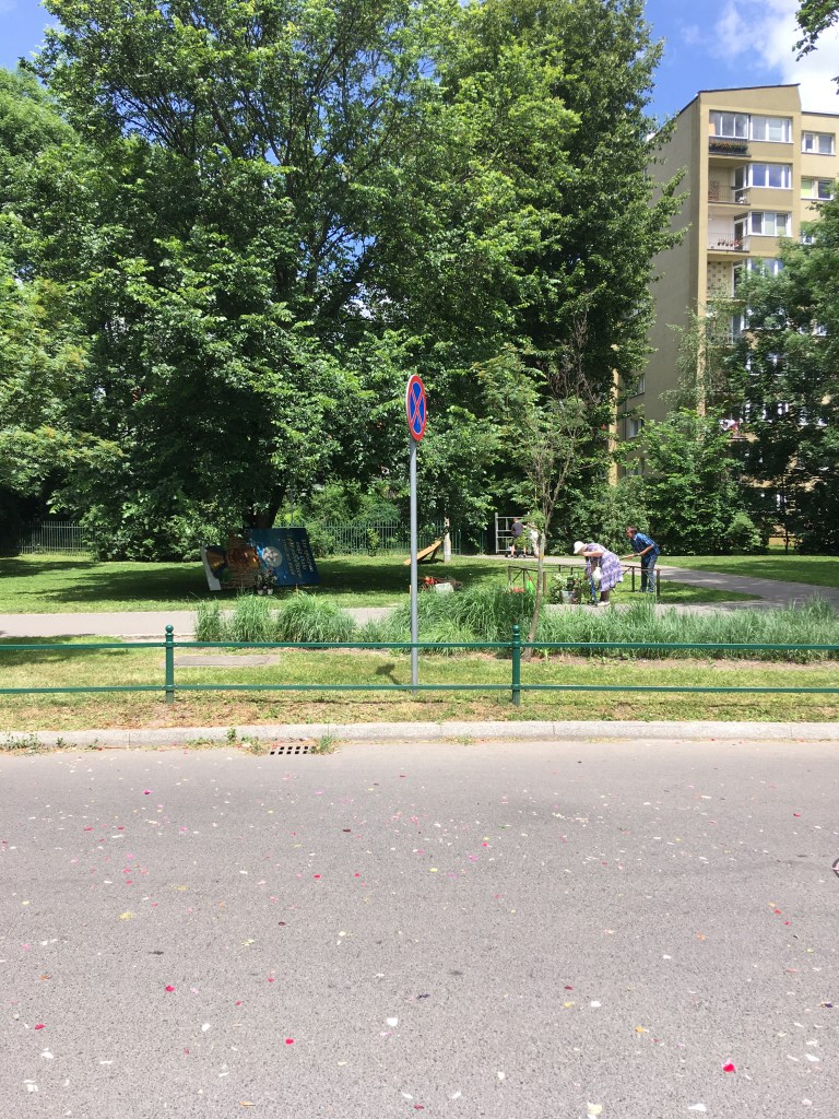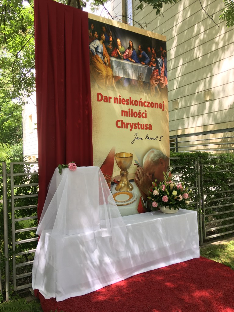 Ve čtvrtek, který je v Polsku také volným dnem (svátek se jmenuje Boże Ciało), bylo v ulicích naší čtvrti slyšet modlení, které znělo, jako kdyby průvod procházel přímo pod okny. Ukázalo se ovšem, že je potřeba trochu hledat a na první stopu jsem narazil je v blízkém parku, kde byl jeden ze čtyř oltářů, které toto procesí obchází.