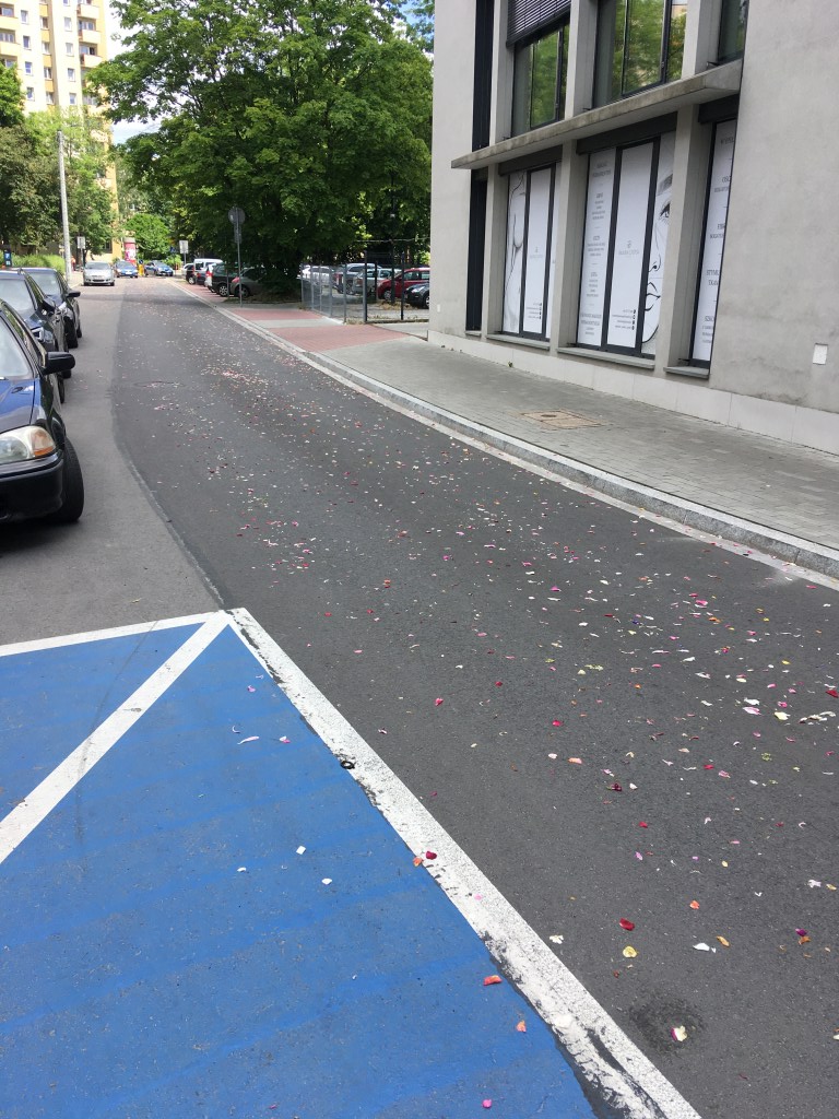 Na silnici bylo vidět zbytky rozsypaných okvětních lístků a v dálce vozy polské policie, které svědčily o tom, že ulice dál je uzavřená. Za křižovatkou již bylo procesí z dálky vidět i slyšet.