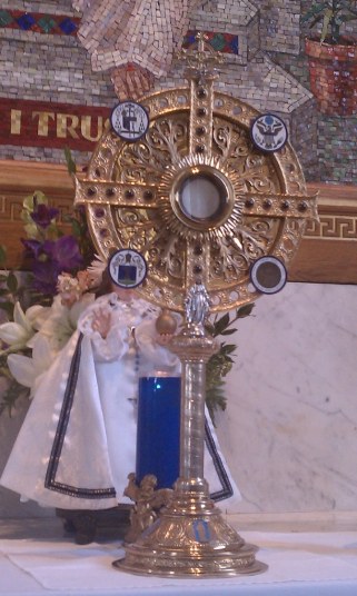 Během průvodů Božího těla kněz nese monstranci (viz fotografie vlevo) s hostií, což je oplatka představující Kristovo tělo.