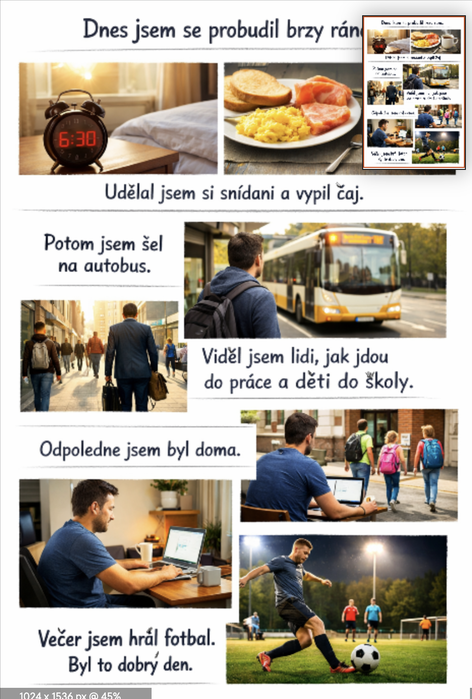 Dnes jsem se probudil brzy ráno. Udělal jsem si snídani a vypil čaj. Potom jsem šel na autobus. Viděl jsem lidi, jak jdou do práce a děti do školy. Odpoledne jsem byl doma a večer jsem hrál fotbal. Byl to dobrý den.
